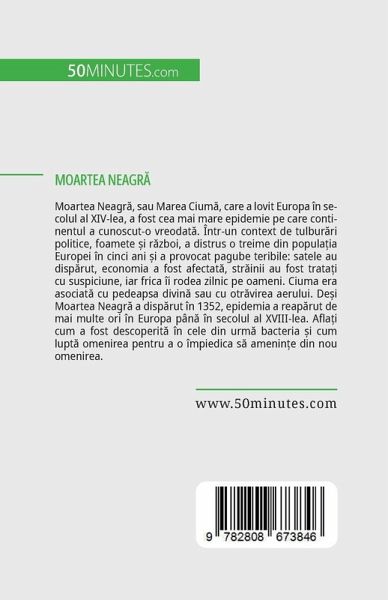 Moartea Neagr¿, sau Marea Cium¿, care a lovit Europa în secolul al XIV-lea, a fost cea mai mare epidemie pe care continentul a cunoscut-o vreodat¿. Într-un context de tulbur¿ri politice, foamete ¿i r¿zboi, a distrus o treime din populäia Europei în cinci ani ¿i a provocat pagube teribile: satele au disp¿rut, economia a fost afectat¿, str¿inii au fost tratäi cu suspiciune, iar frica îi rodea zilnic pe oameni. Ciuma era asociat¿ cu pedeapsa divin¿ sau cu otr¿virea aerului. De¿i Moartea Neagr¿ a disp¿rut în 1352, epidemia a reap¿rut de mai multe ori în Europa pân¿ în secolul al XVIII-lea. Afläi cum a fost descoperit¿ în cele din urm¿ bacteria ¿i cum lupt¿ omenirea pentru a o împiedica s¿ amenin¿e din nou omenirea.