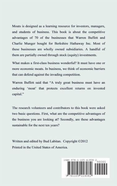 This book describes the enduring competitive advantages of profitable Berkshire Hathaway businesses. MOATS : The Competitive Advantages of Buffett and Munger Businesses explains the competitive nature of 70 selected businesses purchased by Warren Buffett and Charlie Munger for Berkshire Hathaway Incorporated. This is a very useful resource for investors, managers, students of business around the world. It also looks at the sustainability of these competitive advantages in each of the 70 chapters. The moat is the protective barrier around each business' economic castle. Some of these businesses have double and triple moats of protection.
