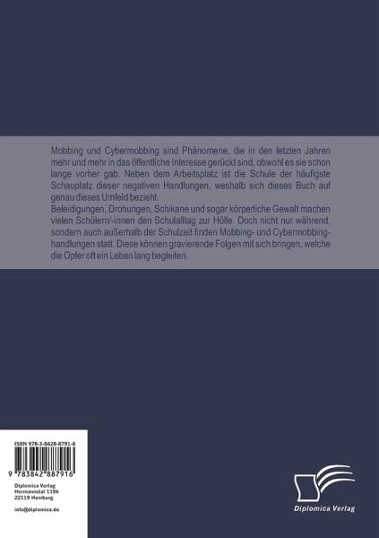 Mobbing und Cybermobbing sind Phänomene, die in den letzten Jahren mehr und mehr in das öffentliche Interesse gerückt sind, obwohl es sie schon lange vorher gab. Neben dem Arbeitsplatz ist die Schule der häufigste Schauplatz dieser negativen Handlungen und darum bezieht sich dieses Buch auf genau dieses Umfeld. Beleidigungen, Drohungen, Schikane und sogar körperliche Gewalt machen vielen Schülern/-innen den Schulalltag zur Hölle. Doch nicht nur während, sondern auch außerhalb der Schulzeit finden Mobbing- und Cybermobbinghandlungen statt und können gravierende Folgen mit sich bringen, welche die Opfer oft ein Leben lang begleiten.