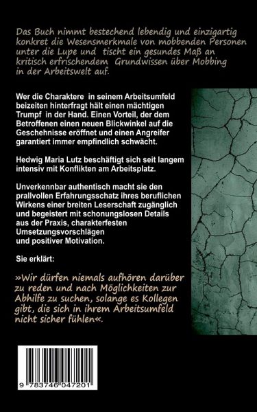 Die Autorin nimmt bestechend lebendig und einzigartig konkret die Wesensmerkmale von mobbenden Personen unter die Lupe und tischt ein gesundes Maß an kritisch erfrischendem Grundwissen über Mobbing in der Arbeitswelt auf.Wer die Charaktere in seinem Arbeitsumfeld beizeiten hinterfragt, hält einen mächtigen Trumpf in der Hand. Einen Vorteil, der dem Betroffenen einen neuen Blickwinkel auf die Geschehnisse eröffnet und einen Angreifer garantiert immer empfindlich schwächt.