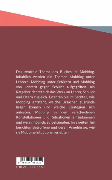 Das zentrale Thema des Buches ist Mobbing. Inhaltlich werden die Themen Mobbing unter Lehrern, Mobbing unter Schülern und Mobbing von Lehrern gegen Schüler aufgegriffen. Als Ratgeber richtet sich das Werk an Lehrer, Schüler und Eltern zugleich. Erfahren Sie im Sachteil, wie Mobbing entsteht, welche Ursachen zugrunde liegen können und welche Strategien sich anbieten, Mobbing in den verschiedenen Konstellationen und Situationen einzudämmen und wenn möglich, zu bekämpfen. Im zweiten Teil berichten Betroffene und deren Angehörige, wie sie Mobbing-Situationen erlebten.