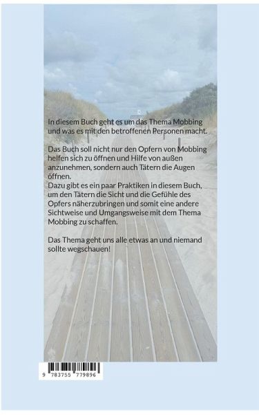 In diesem Buch geht es um das Thema Mobbing und was es mit den betroffenen Personen macht. Das Buch soll nicht nur den Opfern von Mobbing helfen sich zu öffnen und Hilfe von außen anzunehmen, sondern auch Tätern die Augen öffnen. Dazu gibt es ein paar Praktiken in diesem Buch, um den Tätern die Sicht und die Gefühle des Opfers näher zu bringen und somit eine andere Sichtweise und Umgangsweise mit dem Thema Mobbing zu schaffen.Das Thema geht uns alle etwas an und niemand sollte wegschauen!
