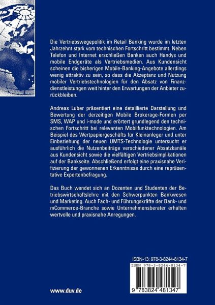 Andreas Luber präsentiert eine detaillierte Darstellung und Bewertung der derzeitigen Mobile Brokerage-Formen per SMS, WAP und i-mode und erörtert grundlegend den technischen Fortschritt bei relevanten Mobilfunktechnologien. Am Beispiel des Wertpapiergeschäfts für Kleinanleger und unter Einbeziehung der neuen UMTS-Technologie untersucht er ausführlich die Nutzenbeiträge verschiedener Absatzkanäle aus Kundensicht sowie die vielfältigen Vertriebsimplikationen auf der Bankseite. Abschließend erfolgt eine praxisnahe Verifizierung der gewonnenen Erkenntnisse durch eine repräsentative Expertenbefragung.