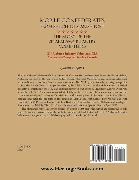 The 21st Alabama Volunteers CSA was created in October 1861 and remained in the vicinity of Mobile, Alabama, for most of the war. It was staffed primarily by local Mobile area men supplemented with some additional men from South Alabama counties. The 21st Regiment included existing companies such as the French Guards, the Spanish Guards, the British Guards and the Mobile Cadets. It served gallantly at Shiloh in April 1862 and suffered heavily in that conflict. Lieutenant George Dixon was a member of the 21st who was wounded at Shiloh; he later died with his crew in command of the submarine Hunley at Charleston after sinking the first enemy warship by submarine warfare. The 21st manned and defended the forts at the mouth of Mobile Bay, Fort Gaines, Fort Morgan and Fort Powell at Grant's Pass as well as forts at Oven Bluff and Choctaw Bluff on the Alabama and Tombigbee Rivers north of Mobile. The 21st suffered the siege and defeat at Spanish Fort in April 1865. The abstracted compiled service records of almost 3,000 men who served are contained in this roster. Entries are arranged alphabetically by surname. A brief history of the 21st Alabama Infantry Volunteers, an appendix and a bibliography add to the value of this work.