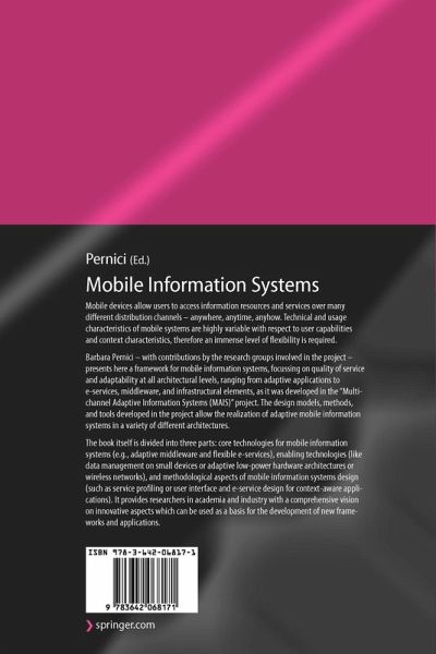 Barbara Pernici - with contributions by the research groups involved in the project - presents here a framework for mobile information systems, focussing on quality of service and adaptability at all architectural levels, ranging from adaptive applications to e-services, middleware, and infrastructural elements, as it was developed in the "Multichannel Adaptive Information Systems (MAIS)" project. The design models, methods, and tools developed in the project allow the realization of adaptive mobile information systems in a variety of different architectures.