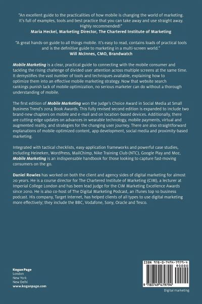 The first edition of Mobile Marketing won the Judge's Choice Award in Social Media at the Small Business Trend's 2014 Book Awards. This fully revised 2nd edition includes straightforward explanations on mobile optimized content, app development, social media and proximity based marketing. It has also expanded to include two brand new chapters on mobile and email and on location-based devices, plus cutting-edge updates on advances in wearable technology, mobile payments, virtual reality and strategies for the changing user journey. Integrated with tactical checklists, easy application frameworks and powerful case study insights such as Heineken, WordPress, MailChimp, Nike Training Club (NTC), Google Play and Moz, it provides a full overview from service provision and technology integration to content strategy, ready to capture fast-moving consumers on the go. Online resources include a digital marketing instructors manual, supporting lecture slides, example exam and self-test questions, and a content calendar template.