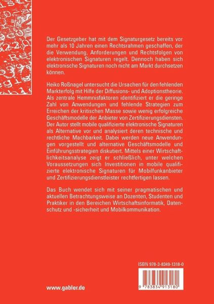 Heiko Roßnagel untersucht die Ursachen für den fehlenden Markterfolg mit Hilfe der Diffusions- und Adoptionstheorie. Als zentrale Hemmnisfaktoren identifiziert er die geringe Zahl von Anwendungen und fehlende Strategien zum Erreichen der kritischen Masse sowie wenig erfolgreiche Geschäftsmodelle der Anbieter von Zertifizierungsdiensten. Der Autor stellt mobile qualifizierte elektronische Signaturen als Alternative vor und analysiert deren technische und rechtliche Machbarkeit. Dabei werden neue Anwendungen vorgestellt und alternative Geschäftsmodelle und Einführungsstrategien diskutiert. Mittels einer Wirtschaftlichkeitsanalyse zeigt er schließlich, unter welchen Voraussetzungen sich Investitionen inmobile qualifizierte elektronische Signaturen für Mobilfunkanbieter und Zertifizierungsdienstleister rechtfertigen lassen.