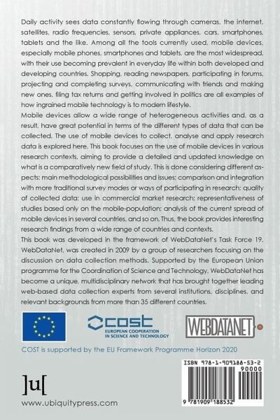 Daily activity sees data constantly fl owing through cameras, the internet, satellites, radio frequencies, sensors, private appliances, cars, smartphones, tablets and the like. Among all the tools currently used, mobile devices, especially mobile phones, smartphones and tablets, are the most widespread, with their use becoming prevalent in everyday life within both developed and developing countries. Shopping, reading newspapers, participating in forums, projecting and completing surveys, communicating with friends and making new ones, filing tax returns and getting involved in politics are all examples of how ingrained mobile technology is to modern lifestyle.Mobile devices allow a wide range of heterogeneous activities and, as a result, have great potential in terms of the different types of data that can be collected. The use of mobile devices to collect, analyse and apply research data is explored here. This book focuses on the use of mobile devices in various research contexts, aiming to provide a detailed and updated knowledge on what is a comparatively new field of study. This is done considering different aspects: main methodological possibilities and issues; comparison and integration with more traditional survey modes or ways of participating in research; quality of collected data; use in commercial market research; representativeness of studies based only on the mobile-population; analysis of the current spread of mobile devices in several countries, and so on. Thus, the book provides interesting research findings from a wide range of countries and contexts.This book was developed in the framework of WebDataNet's Task Force 19. WebDataNet, was created in 2009 by a group of researchers focusing on the discussion on data collection methods. Supported by the European Union programme for the Coordination of Science and Technology, WebDataNet has become a unique, multidisciplinary network that has brought together leading web-based data collection experts from several institutions, disciplines, and relevant backgrounds from more than 35 different countries.