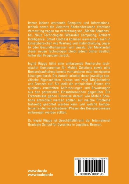 Ingrid Rügge führt eine umfassende Recherche technischer Komponenten für Mobile Solutions sowie eine Bestandsaufnahme bereits vorhandener oder konzipierter so genannter Wearable-Computing-Lösungen durch. Die Autorin arbeitet deren jeweilige spezifische Eigenschaften heraus und zeigt Möglichkeiten und Grenzen auf. Sie stellt die technischen Fakten den qualitativ ermittelten Anforderungen und Erwartungen aus den potenziellen Einsatzbereichen gegenüber.