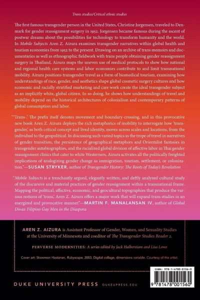 The first famous transgender person in the United States, Christine Jorgensen, traveled to Denmark for gender reassignment surgery in 1952. Jorgensen became famous during the ascent of postwar dreams about the possibilities for technology to transform humanity and the world. In Mobile Subjects Aren Z. Aizura examines transgender narratives within global health and tourism economies from 1952 to the present. Drawing on an archive of trans memoirs and documentaries as well as ethnographic fieldwork with trans people obtaining gender reassignment surgery in Thailand, Aizura maps the uneven use of medical protocols to show how national and regional health care systems and labor economies contribute to and limit transnational mobility. Aizura positions transgender travel as a form of biomedical tourism, examining how understandings of race, gender, and aesthetics shape global cosmetic surgery cultures and how economic and racially stratified marketing and care work create the ideal transgender subject as an implicitly white, global citizen. In so doing, he shows how understandings of travel and mobility depend on the historical architectures of colonialism and contemporary patterns of global consumption and labor.