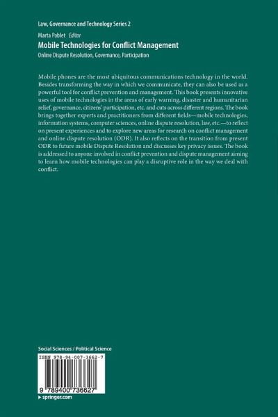 Mobile phones are the most ubiquitous communications technology in the world. Besides transforming the way in which we communicate, they can also be used as a powerful tool for conflict prevention and management. This book presents innovative uses of mobile technologies in the areas of early warning, disaster and humanitarian relief, governance, citizens' participation, etc. and cuts across different regions. The book brings together experts and practitioners from different fields-mobile technologies, information systems, computer sciences, online dispute resolution, law, etc.-to reflect on present experiences and to explore new areas for research on conflict management and online dispute resolution (ODR). It also reflects on the transition from present ODR to future mobile Dispute Resolution and discusses key privacy issues. The book is addressed to anyone involved in conflict prevention and dispute management aiming to learn how mobile technologies can play a disruptive role inthe way we deal with conflict.