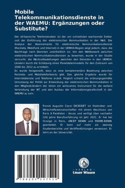 Der afrikanische Telefoniesektor ist der am schnellsten wachsende Sektor seit der Einführung der elektronischen Kommunikation in der Welt. Die Analyse der Abonnements für elektronische Kommunikationsdienste (Festnetz, Mobilfunk und Internet) in der UEMOA-Region zeigt jedoch, dass die Nachfrage nach Diensten uneinheitlich ist. Um den Wettbewerb zwischen elektronischen Kommunikationsdiensten zu bewerten, wurde in der Studie versucht, die Wechselbeziehungen zwischen den Diensten in den UEMOA-Ländern durch die Schätzung eines Paneldatenmodells für den Zeitraum von 2000 bis 2012 zu ermitteln. Es wurde festgestellt, dass es eine komplementäre Beziehung zwischen Festnetz- und Mobiltelefonbesitz gibt. Das gleiche Ergebnis wurde für Internetdienste und Telefonie erzielt. Folglich scheint die ordnungsgemäße Umsetzung der Politik zur Entwicklung der elektronischen Kommunikation in den Mitgliedsländern der Union ein wirksames Instrument für die weitere Verbreitung der IKT und den Ausbau der Informationsgesellschaft in der WAEMU zu sein.
