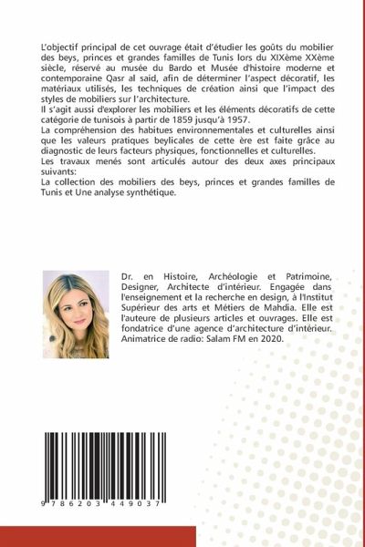 L'objectif principal de cet ouvrage était d'étudier les goûts du mobilier des beys, princes et grandes familles de Tunis lors du XIXème XXème siècle, réservé au musée du Bardo et Musée d'histoire moderne et contemporaine Qasr al said, afin de déterminer l'aspect décoratif, les matériaux utilisés, les techniques de création ainsi que l'impact des styles de mobiliers sur l'architecture.Il s'agit aussi d'explorer les mobiliers et les éléments décoratifs de cette catégorie de tunisois à partir de 1859 jusqu'à 1957.La compréhension des habitues environnementales et culturelles ainsi que les valeurs pratiques beylicales de cette ère est faite grâce au diagnostic de leurs facteurs physiques, fonctionnelles et culturelles.Les travaux menés sont articulés autour des deux axes principaux suivants:La collection des mobiliers des beys, princes et grandes familles de Tunis et Une analyse synthétique.