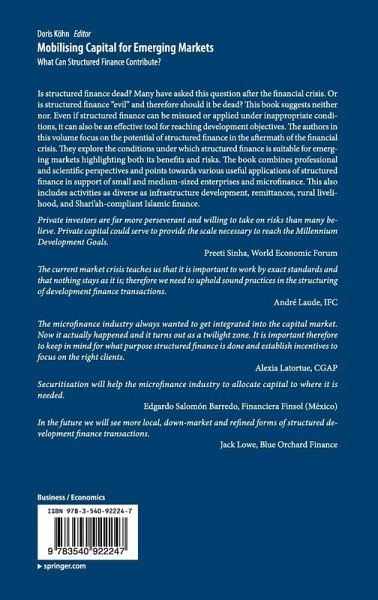 Is structured finance dead? Many have asked this question after the financial crisis. Or is structured finance "evil" and therefore should it be dead? This book suggests neither nor. Even if structured finance can be misused or applied under inappropriate conditions, it can also be an effective tool for reaching development objectives. The authors in this volume focus on the potential of structured finance in the aftermath of the financial crisis. They explore the conditions under which structured finance is suitable for emerging markets highlighting both its benefits and risks. The book combines professional and scientific perspectives and points towards various useful applications of structured finance in support of small and medium-sized enterprises and microfinance. This also includes activities as diverse as infrastructure development, remittances, rural livelihood, and Shari'ah-compliant Islamic finance.