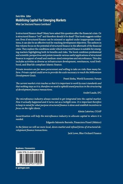 Is structured finance dead? Many have asked this question after the financial crisis. Or is structured finance "evil" and therefore should it be dead? This book suggests neither nor. Even if structured finance can be misused or applied under inappropriate conditions, it can also be an effective tool for reaching development objectives. The authors in this volume focus on the potential of structured finance in the aftermath of the financial crisis. They explore the conditions under which structured finance is suitable for emerging markets highlighting both its benefits and risks. The book combines professional and scientific perspectives and points towards various useful applications of structured finance in support of small and medium-sized enterprises and microfinance. This also includes activities as diverse as infrastructure development, remittances, rural livelihood, and Shari'ah-compliant Islamic finance.
