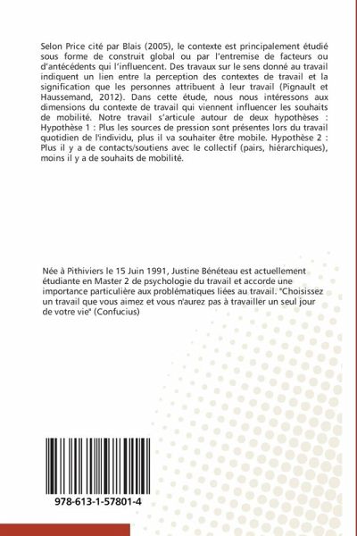 Selon Price cité par Blais (2005), le contexte est principalement étudié sous forme de construit global ou par l'entremise de facteurs ou d'antécédents qui l'influencent. Des travaux sur le sens donné au travail indiquent un lien entre la perception des contextes de travail et la signification que les personnes attribuent à leur travail (Pignault et Haussemand, 2012). Dans cette étude, nous nous intéressons aux dimensions du contexte de travail qui viennent influencer les souhaits de mobilité. Notre travail s'articule autour de deux hypothèses : Hypothèse 1 : Plus les sources de pression sont présentes lors du travail quotidien de l'individu, plus il va souhaiter être mobile. Hypothèse 2 : Plus il y a de contacts/soutiens avec le collectif (pairs, hiérarchiques), moins il y a de souhaits de mobilité.