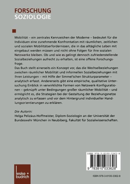 Das Buch stellt einerseits ein Konzept vor, das die Wechselbeziehungen zwischen räumlicher Mobilität und informellen Sozialbeziehungen mit ihren Leistungen - mit Hilfe der Simmel'schen Strukturparameter - analytisch erfasst. Andererseits gibt eine empirische, qualitative Untersuchung Einblick in verwirklichte Formen von Netzwerk-Konfigurationen - geknüpft unter Bedingungen großer räumlicher Mobilität - und ermöglicht es, die Strategien bei der Gestaltung der Beziehungsnetze analytisch zu erfassen und vor dem Hintergrund individueller Handlungsorientierungen zu erklären.