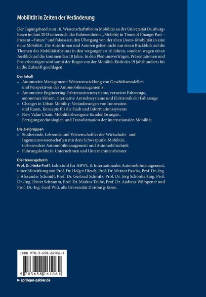 Der Tagungsband zum 10. Wissenschaftsforum Mobilität an der Universität Duisburg-Essen im Juni 2018 untersucht das Rahmenthema "Mobility in Times of Change: Past - Present -Future" und fokussiert den Übergang von der alten (Auto-)Mobilität in eine neue Mobilität. Die Autorinnen und Autoren geben nicht nur einen Rückblick auf die Themen des Mobilitätsforums in den vergangenen 10 Jahren, sondern wagen einen Ausblick auf die kommenden 10 Jahre. In den Plenumsvorträgen, Präsentationen und Posterbeiträgen wird somit der Bogen von der Mobilität Ende des 19 Jahrhunderts bis in die Zukunft geschlagen.