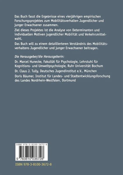 Das Buch fasst die Ergebnisse eines vierjährigen Forschungsprojektes zum Mobilitätsverhalten Jugendlicher und junger Erwachsener zusammen. Ziel dieses Projektes ist die Analyse von Determinanten und individuellen Motive jugendlicher Mobilität und Verkehrsmittelwahl. Das Buch will zu einem detaillierteren Verständnis des Mobilitätsverhaltens Jugendlicher und junger Erwachsener beitragen.