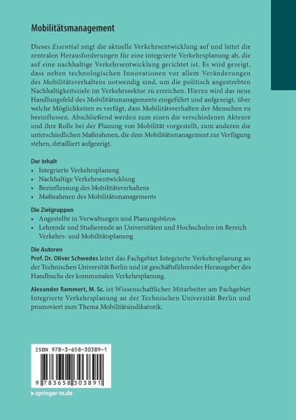 Dieses Essential zeigt die aktuelle Verkehrsentwicklung auf und leitet die zentralen Herausforderungen für eine integrierte Verkehrsplanung ab, die auf eine nachhaltige Verkehrsentwicklung gerichtet ist. Es wird gezeigt, dass neben technologischen Innovationen vor allem Veränderungen des Mobilitätsverhaltens notwendig sind, um die politisch angestrebten Nachhaltigkeitsziele im Verkehrssektor zu erreichen. Hierzu wird das neue Handlungsfeld des Mobilitätsmanagements eingeführt und aufgezeigt, über welche Möglichkeiten es verfügt, dass Mobilitätsverhalten der Menschen zu beeinflussen. Abschließend werden zum einen die verschiedenen Akteure und ihre Rolle bei der Planung von Mobilität vorgestellt, zum anderen die unterschiedlichen Maßnahmen, die dem Mobilitätsmanagement zur Verfügung stehen, detailliert aufgezeigt.