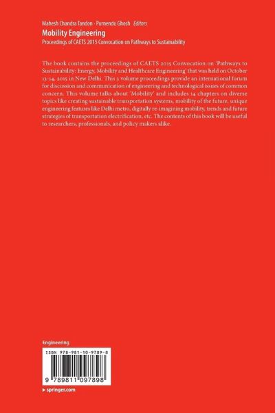 The book contains the proceedings of CAETS 2015 Convocation on 'Pathways to Sustainability: Energy, Mobility and Healthcare Engineering' that was held on October 13-14, 2015 in New Delhi. This 3 volume proceedings provide an international forum for discussion and communication of engineering and technological issues of common concern. This volume talks about 'Mobility' and includes 14 chapters on diverse topics like creating sustainable transportation systems, mobility of the future, unique engineering features like Delhi metro, digitally re-imagining mobility, trends and future strategies of transportation electrification, etc. The contents of this book will be useful to researchers, professionals, and policy makers alike.