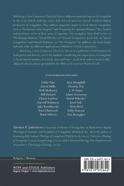Mobilizing a Great Commission Church for Harvest addresses practical aspects of evangelism in the local church, with the voices and views of nineteen current Southern Baptist professors of evangelism. They address important topics to local church evangelism, such as ""Invitations with integrity"" and ""Preparing for Spiritual Warfare."" Key leaders and professors write in their areas of expertise. For examples, Alvin Reid writes on ""Mobilizing Students,"" David Wheeler on ""Servant Evangelism,"" Josef Solc on ""Sports Evangelism,"" and Darrell Robinson on ""The Evangelist."" In addition, the book begins and ends with two different applications of Matthew's Great Commission. Mobilizing a Great Commission Church for Harvest is a gold mine of information for both pastor and deacon, as it is for students considering the importance of evangelism to local church ministry. It is fresh, new, and true--as all of its authors teach at SBC-affiliated schools and are grounded in the Bible as the inerrant Word of God!