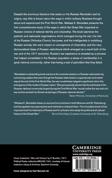 The First World War had a devastating impact on the Russian state, yet relatively little is known about the ways in which ordinary Russians experienced and viewed this conflict. Melissa Kirschke Stockdale presents the first comprehensive study of the Great War's influence on Russian notions of national identity and citizenship. Drawing on a vast array of sources, the book examines the patriotic and nationalist organizations which emerged during the war, the role of the Russian Orthodox Church, the press and the intelligentsia in mobilizing Russian society, the war's impact on the rights of citizens, and the new, democratized ideas of Russian nationhood which emerged both as a result of the war and of the 1917 revolution. Russia's war experience is revealed as a process that helped consolidate in the Russian population a sense of membership in a great national community, rather than being a test of patriotism which they failed.