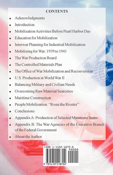 CONTENTS: Acknowledgments Introduction Mobilization Activities Before Pearl Harbor Day Education for Mobilization Interwar Planning for Industrial Mobilization Mobilizing for War: 1939 to 1941 The War Production Board The Controlled Materials Plan The Office of War Mobilization and Reconversion U.S. Production in World War II Balancing Military and Civilian Needs Overcoming Raw Material Scarcities Maritime Construction People Mobilization: "Rosie the Riveter" Conclusions Appendix A: Production of Selected Munitions Items Appendix B: The War Agencies of the Executive Branch of the Federal Government About the Author