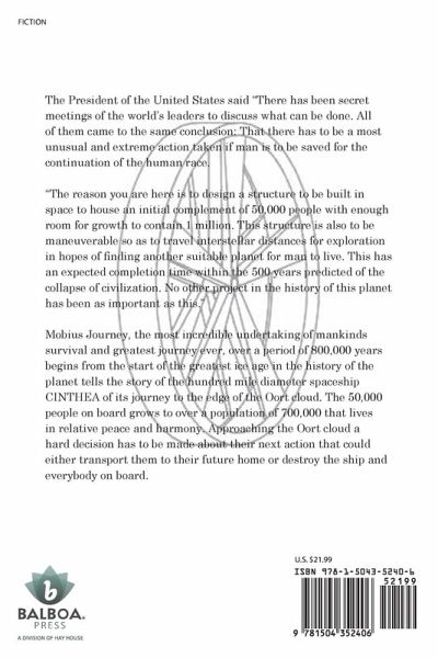 The President of the United States said "There has been secret meetings of the world's leaders to discuss what can be done. All of them came to the same conclusion: That there has to be a most unusual and extreme action taken if man is to be saved for the continuation of the human race. "The reason you are here is to design a structure to be built in space to house an initial complement of 50,000 people with enough room for growth to contain 1 million. This structure is also to be maneuverable so as to travel interstellar distances for exploration in hopes of finding another suitable planet for man to live. This has an expected completion time within the 500 years predicted of the collapse of civilization. No other project in the history of this planet has been as important as this." Mobius Journey, the most incredible undertaking of mankinds survival and greatest journey ever, over a period of 800,000 years begins from the start of the greatest ice age in the history of the planet tells the story of the hundred mile diameter spaceship CINTHEA of its journey to the edge of the Oort cloud. The 50,000 people on board grows to over a population of 700,000 that lives in relative peace and harmony. Approaching the Oort cloud a hard decision has to be made about their next action that could either transport them to their future home or destroy the ship and everybody on board.