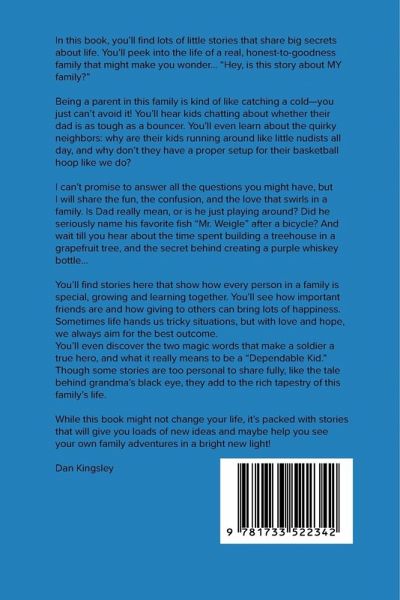 Dive into a whirlpool of tales that unveil the deep-seated secrets of life through the lens of a vibrant and candid family narrative. This book is a delightful collection of small stories that hold the grandeur of life's many secrets, presented through the intricate dynamics of a family that could very well be your own. From the adventures of an unusually tough dad to the quirky habits of the neighbors, every story is a sneak peek into a world teeming with joy, curiosity, and the sheer unpredictability of a family that is learning and growing together, one day at a time. Each story is a revelation, a glimpse into the profound lessons learned from a father who sometimes resembles a bouncer more than a parent. The narratives span the spectrum from humorous to heartfelt, pulling you into a whirlwind of emotions as you navigate through the family's adventures and misadventures, including the creation of a treehouse in a grapefruit tree and the whimsical tale behind a purple whiskey bottle. But it's not just about the laughter and the joy; it's about the deep connections forged through friendship, the selflessness ingrained through familial bonds, and the vital lessons imparted on the road to adulthood. It is about learning the true essence of love, the joy derived from giving, and the hopeful prayers for a favorable outcome even in the face of life's unpredictable cards. Through these narratives, you will also delve into the valuable lessons learned from a heroic soldier, unraveling the secrets of leadership and the true meaning of being "Dependable." It is a journey that promises to reveal the core of human emotion, touching upon personal stories too sensitive to delve deep into but too significant to leave untold. This book offers not just a collection of stories, but a rich tapestry of experiences that might resonate with your own life, sparking recognition, and encouraging reflection. It doesn't promise a transformation, but it assures a plethora of ideas, a warm embrace of familiar yet unique experiences, and perhaps a fresher, brighter perspective to view the adventures of your own life. Join us in this heartwarming journey through a lifetime of stories that echo the universal truths of life, promising to leave you with a heart a bit warmer and a spirit kindled with the vibrant hues of familial love and life in all its glorious unpredictability.