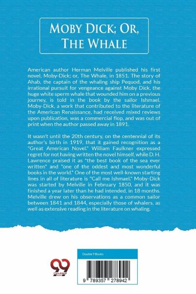 American author Herman Melville published his first novel, Moby-Dick; or, The Whale, in 1851. The story of Ahab, the captain of the whaling ship Pequod, and his irrational pursuit for vengeance against Moby Dick, the huge white sperm whale that wounded him on a previous journey, is told in the book by the sailor Ishmael. Moby-Dick, a work that contributed to the literature of the American Renaissance, had received mixed reviews upon publication, was a commercial flop, and was out of print when the author passed away in 1891. It wasn't until the 20th century, on the centennial of its author's birth in 1919, that it gained recognition as a "Great American Novel." William Faulkner expressed regret for not having written the novel himself, while D. H. Lawrence praised it as "the best book of the sea ever written" and "one of the oddest and most wonderful books in the world." One of the most well-known starting lines in all of literature is "Call me Ishmael." Moby-Dick was started by Melville in February 1850, and it was finished a year later than he had intended, in 18 months. Melville drew on his observations as a common sailor between 1841 and 1844, especially those of whalers, as well as extensive reading in the literature on whaling.