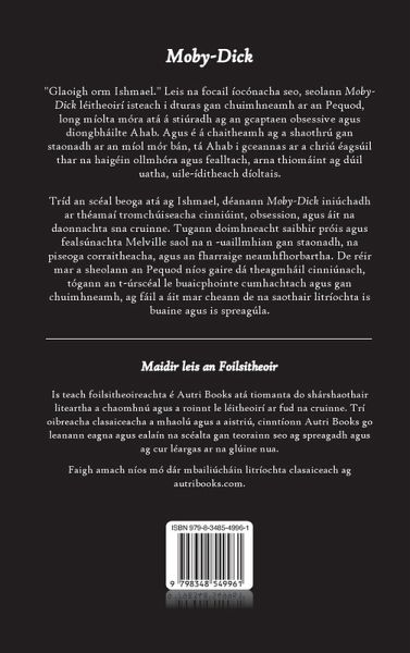 Téann Ishmael, mairnéalach neamhshuaimhneach, ar thuras míolta móra ar bord an Pequod faoi cheannas an Chaptaen Ahab, fear a chaitheann an t -uafás diongbháilte ar an míol mór bán, Moby Dick. De réir mar a sheolann an fhoireann níos doimhne isteach san aigéan ollmhór agus neamhfhorbartha, bíonn contúirt, cairdeas, agus tarraingt na ndán dosheachanta acu. Tiomáineann obsession Ahab iad go léir i dtreo achrann eipiciúil a dhéanfaidh tástáil ar theorainneacha seasmhachta agus cinniúint an duine.Is éard atá i gceist le Eachtraíochta, Fealsúnacht, agus Prós Filíochta, Moby-Dick, iniúchadh cumhachtach ar uaillmhian, díoltas, agus na rúndiamhra a bhaineann le bheith ann. Is bunchloch de litríocht Mheiriceá é, agus leanann úrscéal Herman Melville ar aghaidh ag cur ina luí ar léitheoirí lena dhoimhneacht agus a dhéine.