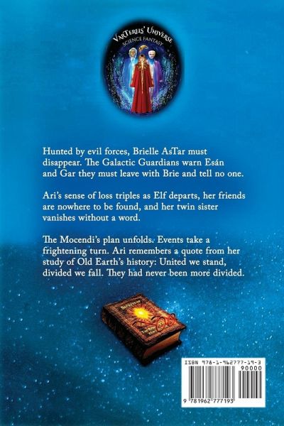 Hunted by evil forces, Brielle AsTar must disappear. The Galactic Guardians warn Esán and Gar they must leave with Brie and tell no one. Ari's sense of loss triples as Elf departs, her friends are nowhere to be found, and her twin sister vanishes without a word. The Mocendi's plan unfolds. Events take a frightening turn. Ari remembers a quote from her study of Old Earth's history: United we stand, divided we fall. She shuddered. They had never been more divided.