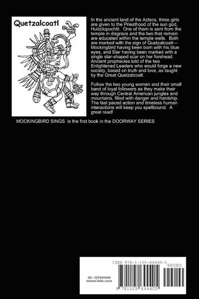 In the ancient land of the Aztecs, three girls are given to the Priesthood of the sun god, Huitzilopochtli. One of them is sent from the temple in disgrace and the two that remain are educated within the temple walls. Both are marked with the sign of Quetzalcoatl-Mockingbird having been born with his blue eyes, and Star having been marked with a single star-shaped scar on her forehead. Ancient prophecies told of the two Enlightened Leaders who would forge a new society, based on truth and love, as taught by the Great Quetzalcoatl. Follow the two young women and their small band of loyal followers as they make their way through Central American jungles and mountains, filled with danger and hardship. The fast paced action and timeless human interactions will keep you spellbound. A great read!