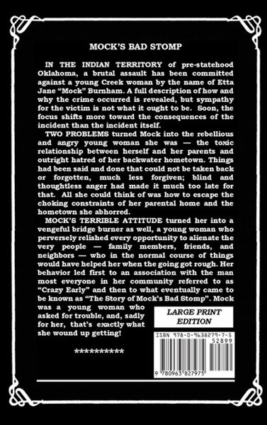 MOCK'S BAD STOMP In the Indian Territory of pre-statehood Oklahoma, a brutal assault has been committed against a young Creek woman by the name of Etta Jane "Mock" Burnham. A full description of how and why the assault occurred is revealed, but, surprisingly, sympathy for the victim is not what it ought to be. Soon, the focus shifts more toward the consequences of the crime than the incident itself. Two personal problems had turned Mock into the rebellious and angry young woman she was - the toxic relationship that existed between herself and her parents and her outright hatred of her backwater hometown. Things had been said and done that could not be taken back or forgotten, much less forgiven; blind and thoughtless anger on Mock's part had made it much too late for that. All she could think of was how to escape the choking constraints of her parental home and the hometown she abhorred. Mock's own terrible attitude had turned her into a vengeful bridge burner as well, a young woman who had not only taken full advantage of but also perversely relished every opportunity that arose to alienate the very people - family members, friends, and neighbors - who in the normal course of things would have helped her when the going got rough. Her own behavior led first to an ill-fated association with the man most everyone in her community referred to as "Crazy Early" and then to what eventually came to be referred to as "The Story of Mock's Bad Stomp". Mock was a young woman who asked for trouble, and, sadly for her, that's exactly what she wound up getting. *****