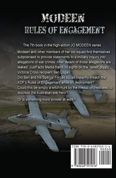 Honour and truth are worth defending... Modeen and other members of her old Special Forces squad find themselves subpoenaed to provide statements to a military inquiry into allegations of war crimes. After details of those allegations are leaked to the press, JustFacts Media trains its sights on the 'tallest poppy', Victoria Cross recipient Ben Logan. Did Ben and his squad blatantly breach the ADF's Rules of Engagement while on deployment? Could this be simply a witch-hunt by the media, orchestrated to discredit the Australian war hero? Or is something more sinister at work? Modeen: Rules of Engagement is the 7th book in the high-action JO MODEEN series.
