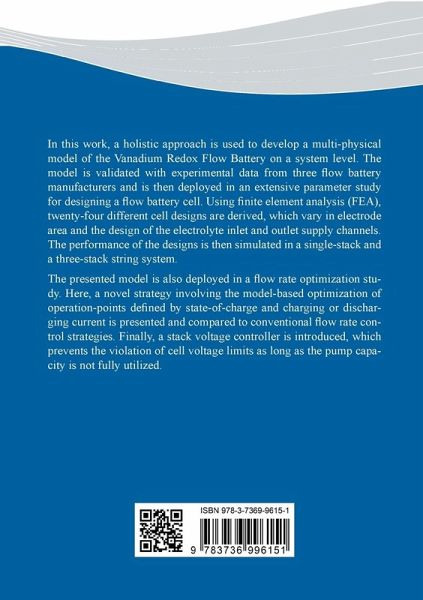 In this work, a holistic approach is used to develop a multi-physical model of the Vanadium Redox Flow Battery on a system level. The model is validated with experimental data from three flow battery manufacturers and is then deployed in an extensive parameter study for designing a flow battery cell. Using finite element analysis (FEA), twenty-four different cell designs are derived, which vary in electrode area and the design of the electrolyte inlet and outlet supply channels. The performance of the designs is then simulated in a single-stack and a three-stack string system. The presented model is also deployed in a flow rate optimization study. Here, a novel strategy involving the model-based optimization of operation-points defined by state-of-charge and charging or discharging current is presented and compared to conventional flow rate control strategies. Finally, a stack voltage controller is introduced, which prevents the violation of cell voltage limits as long as the pump capacity is not fully utilized.