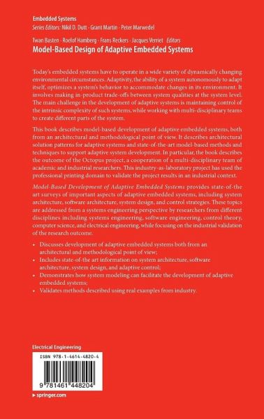Model-Based Development of Adaptive Embedded Systems focuses on the development of adaptive embedded systems both from an architectural and methodological point of view. It describes architectural solution patterns for adaptive systems and state-of-the-art model-based methods and techniques to support adaptive system development. In particular, the book describes the outcome of the Octopus project, a cooperation of a multi-disciplinary team of academic and industrial researchers. This industry-as-laboratory project has used the professional printing domain to validate the project results in an industrial context.