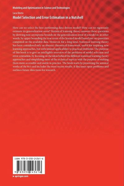 How can we select the best performing data-driven model? How can we rigorously estimate its generalization error? Statistical learning theory answers these questions by deriving non-asymptotic bounds on the generalization error of a model or, in other words, by upper bounding the true error of the learned model based just on quantities computed on the available data. However, for a long time, Statistical learning theory has been considered only an abstract theoretical framework, useful for inspiring new learning approaches, but with limited applicability to practical problems. The purpose of this book is to give an intelligible overview of the problems of model selection and error estimation, by focusing on the ideas behind the different statistical learning theory approaches and simplifying most of the technical aspects with the purpose of making them more accessible and usable in practice. The book starts by presenting the seminal works of the 80's and includes the most recent results. It discusses open problems and outlines future directions for research.