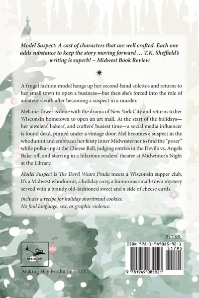 A frugal fashion model hangs up her second-hand stilettos and returns to her small town to open a business-but then she's forced into the role of amateur sleuth after becoming a suspect in a murder. Melanie Tower is done with the drama of New York City and returns to her Wisconsin hometown to open an art mall. At the start of the holiday season-her jewelers', bakers', and crafters' busiest time-a social media influencer is found dead, pinned under a vintage door. Mel immediately becomes a suspect in the holiday mystery because the victim had been recruiting her best artists to open a competing store! Mel embraces her feisty inner Midwesterner to find the "poser" while polka-ing at the Cheese Ball, judging entries in the Devil's vs. Angels Bake-off, and starring in a hilarious readers' theater at Midwinter's Night at the Library. Model Suspect is The Devil Wears Prada meets a Wisconsin supper club. It's a Midwest whodunnit, a holiday cozy, a humorous small-town mystery served with a brandy old-fashioned sweet and a side of cheese curds. Includes a recipe for holiday shortbread cookies. No foul language, sex, or graphic violence.