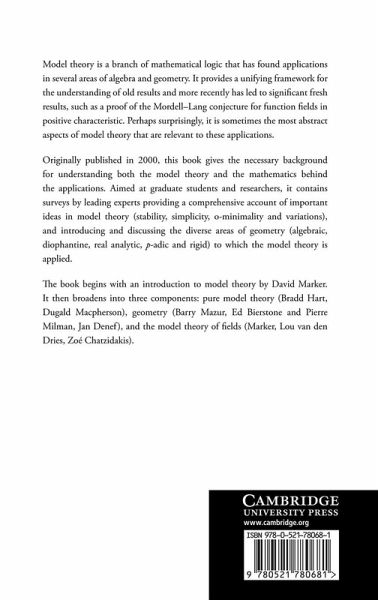 Model theory is a branch of mathematical logic that has found applications in several areas of algebra and geometry. It provides a unifying framework for the understanding of old results and more recently has led to significant new results, such as a proof of the Mordell-Lang conjecture for function fields in positive characteristic. Perhaps surprisingly, it is sometimes the most abstract aspects of model theory that are relevant to those applications. This book gives the necessary background for understanding both the model theory and the mathematics behind the applications. Aimed at graduate students and researchers, it contains introductory surveys by leading experts covering the whole spectrum of contemporary model theory (stability, simplicity, o-minimality and variations), and introducing and discussing the diverse areas of geometry (algebraic, diophantine, real analytic, p-adic, and rigid) to which the model theory is applied. The book begins with an introduction to model theory by David Marker. It then broadens into three components: pure model theory (Bradd Hart, Dugald Macpherson), geometry(Barry Mazur, Ed Bierstone and Pierre Milman, Jan Denef), and the model theory of fields (Marker, Lou van den Dries, Zoe Chatzidakis).