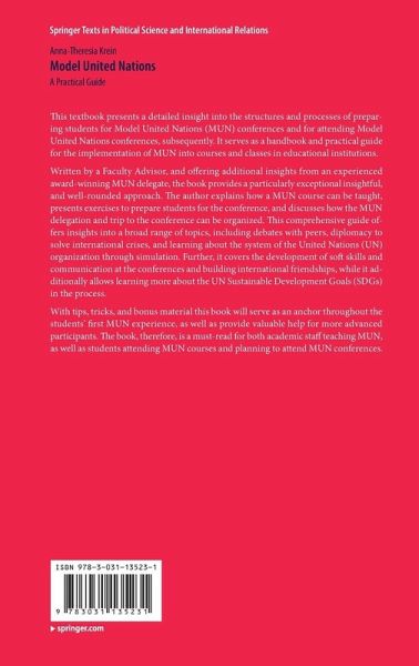 Written by a Faculty Advisor, and offering additional insights from an experienced award-winning MUN delegate, the book provides a particularly exceptional insightful, and well-rounded approach. The author explains how a MUN course can be taught, presents exercises to prepare students for the conference, and discusses how the MUN delegation and trip to the conference can be organized. This comprehensive guide offers insights into a broad range of topics, including debates with peers, diplomacy to solve international crises, and learning about the system of the United Nations (UN) organization through simulation. Further, it covers the development of soft skills and communication at the conferences and building international friendships, while it additionally allows learning more about the UN Sustainable Development Goals (SDGs) in the process.