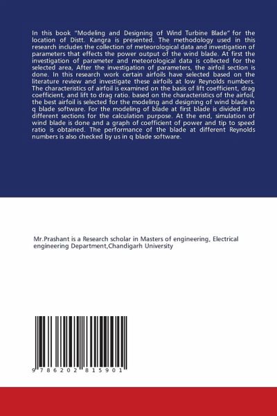 In this book "Modeling and Designing of Wind Turbine Blade" for the location of Distt. Kangra is presented. The methodology used in this research includes the collection of meteorological data and investigation of parameters that effects the power output of the wind blade. At first the investigation of parameter and meteorological data is collected for the selected area, After the investigation of parameters, the airfoil section is done. In this research work certain airfoils have selected based on the literature review and investigate these airfoils at low Reynolds numbers. The characteristics of airfoil is examined on the basis of lift coefficient, drag coefficient, and lift to drag ratio. based on the characteristics of the airfoil, the best airfoil is selected for the modeling and designing of wind blade in q blade software. For the modeling of blade at first blade is divided into different sections for the calculation purpose. At the end, simulation of wind blade is done anda graph of coefficient of power and tip to speed ratio is obtained. The performance of the blade at different Reynolds numbers is also checked by us in q blade software.