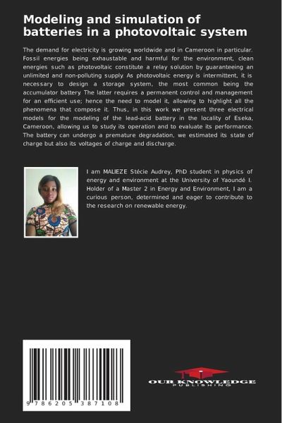 The demand for electricity is growing worldwide and in Cameroon in particular. Fossil energies being exhaustable and harmful for the environment, clean energies such as photovoltaic constitute a relay solution by guaranteeing an unlimited and non-polluting supply. As photovoltaic energy is intermittent, it is necessary to design a storage system, the most common being the accumulator battery. The latter requires a permanent control and management for an efficient use; hence the need to model it, allowing to highlight all the phenomena that compose it. Thus, in this work we present three electrical models for the modeling of the lead-acid battery in the locality of Eseka, Cameroon, allowing us to study its operation and to evaluate its performance. The battery can undergo a premature degradation, we estimated its state of charge but also its voltages of charge and discharge.