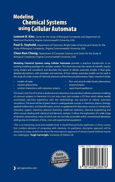 Modeling Chemical Systems using Cellular Automata provides a practical introduction to an exciting modeling paradigm for complex systems. The book first discusses the nature of scientific inquiry using models and simulations, and then describes the nature of cellular automata models. It then gives detailed descriptions, with examples and exercises, of how cellular automata models can be used in the study of a wide variety chemical, physical, and biochemical phenomena. Topics covered include models of water itself, solution phenomena, solution interactions with stationary systems, first- and second-order kinetic phenomena, enzyme kinetics, vapor-liquid equilibrium, and atomic and molecular excited-state kinetics. The student experiences these systems through hands-on examples and guided studies.