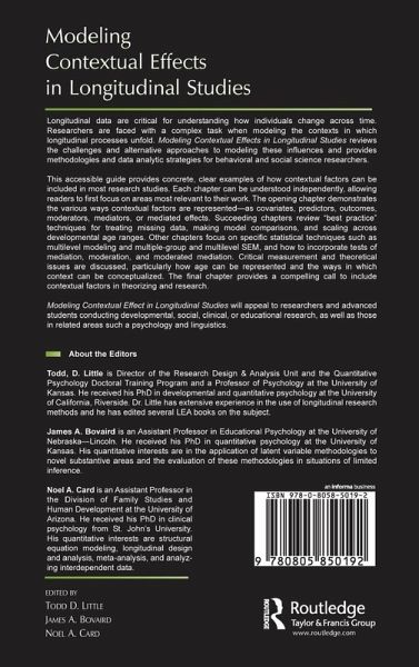 Todd D. Little is Director of the Research Design Unit and the Quantitative Psychology Doctoral training Program and a Professor of Psychology at the University of Kansas. He received his Ph.D. in developmental and quantitative psychology at the University of California - Riverside. Dr. Little has extensive experience in the use of longitudinal research methods, and he has edited several LEA books on the subject. James A. Bovaird is an Assistant Professor in Educational Psychology at the University of Nebraska - Lincoln. He received his Ph.D. in quantitative psychology at the University of Kansas. His quantitative interests are in the application of latent variable methodologies to novel substantive areas and the evaluation of these methodologies in situations of limited inference. Noel A. Card is an Assistant Professor in the Division of Family Studies and Human Development at the University of Arizona. He received his Ph.D. in clinical psychology from St. John's University. His quantitative interests are structural equation modeling, longitudinal design and analysis, meta-analysis, and analyzing interdependent data.