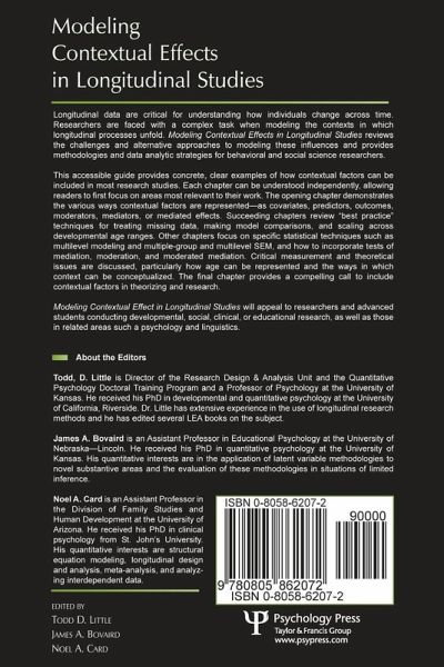 This volume reviews the various approaches to modeling how individuals change across time and provides methodologies and data analytic strategies for behavioral and social science researchers. This accessible guide provides concrete examples of how contextual factors can be included in research studies. The opening chapter demonstrates the various ways contextual factors are represented-as covariates, predictors, outcomes, moderators, mediators, or mediated effects. Succeeding chapters review "best practice" techniques for treating missing data, making model comparisons, and scaling across developmental age ranges. Other chapters focus on specific techniques such as multilevel modeling, multiple-group and multilevel SEM, and how to incorporate tests of mediation. Critical measurement and theoretical issues are discussed, particularly how age can be represented and the ways in which context can be conceptualized. This book will appeal to researchers and advanced students conducting developmental, social, clinical, or educational research, as well as those in related areas such as psychology and linguistics.