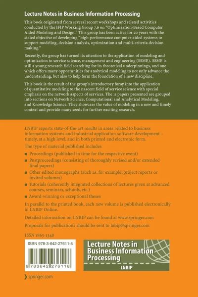 This book originated from several recent workshops and related activities conducted by the IFIP Working Group 7.6 on "Optimization-Based Computer Aided Modeling and Design." This group has been active for 20 years with the stated objective of developing "high-performance computer-aided systems to support modeling, decision analysis, optimization and multi-criteria decision making."Recently, the group has turned its attention to the application of modeling and optimization to service science, management and engineering (SSME). SSME is still a young research field searching for its theoretical underpinnings, and one which offers many opportunities for analytical modeling to not only advance the understanding, but also to help form the foundation of a new discipline.This book is the result of the group's introductory foray into the application of quantitative modeling to the nascent field of service science with special emphasis on the network aspects of services. The 11 papers presented are grouped into sections on Network Science, Comptational and Analytical Modeling, and Knowledge Science. They showcase the value of modeling in a new and timely context and provide many seeds for further exciting research.