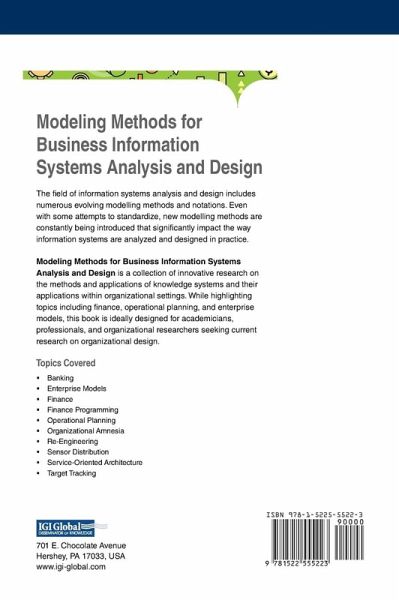 The field of information systems analysis and design includes numerous evolving modelling methods and notations. Even with some attempts to standardize, new modelling methods are constantly being introduced that significantly impact the way information systems are analyzed and designed in practice. Modeling Methods for Business Information Systems Analysis and Design is a collection of innovative research on the methods and applications of knowledge systems and their applications within organizational settings. While highlighting topics including finance, operational planning, and enterprise models, this book is ideally designed for academicians, professionals, and organizational researchers seeking current research on organizational design.