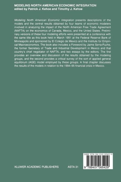 Modeling North American Economic Integration presents descriptions of the models and the central results obtained by four teams of economic modelers who analyze the impact of the North American Free Trade Agreement (NAFTA) on the economies of Canada, Mexico and the USA. Preliminary versions of these four modeling efforts were presented at a conference with the same title as the book, held in March 1991 at the Federal Reserve Bank of Minneapolis and sponsored by El Colegio de Mexico and the Institute for Empirical Macroeconomics. The book also includes a Foreword by Jaime Serra-Puche, the former Secretary of Trade and Industrial Development in Mexico and that country's chief negotiator of NAFTA, plus two essays by the editors. The first provides an overview and discussion of the results obtained by the modeling groups, and the second provides a critical survey of the sort of applied general equilibrium model employed by these groups. A final chapter discusses the results of the models in relation to the 1994-95 financial crisis in Mexico.